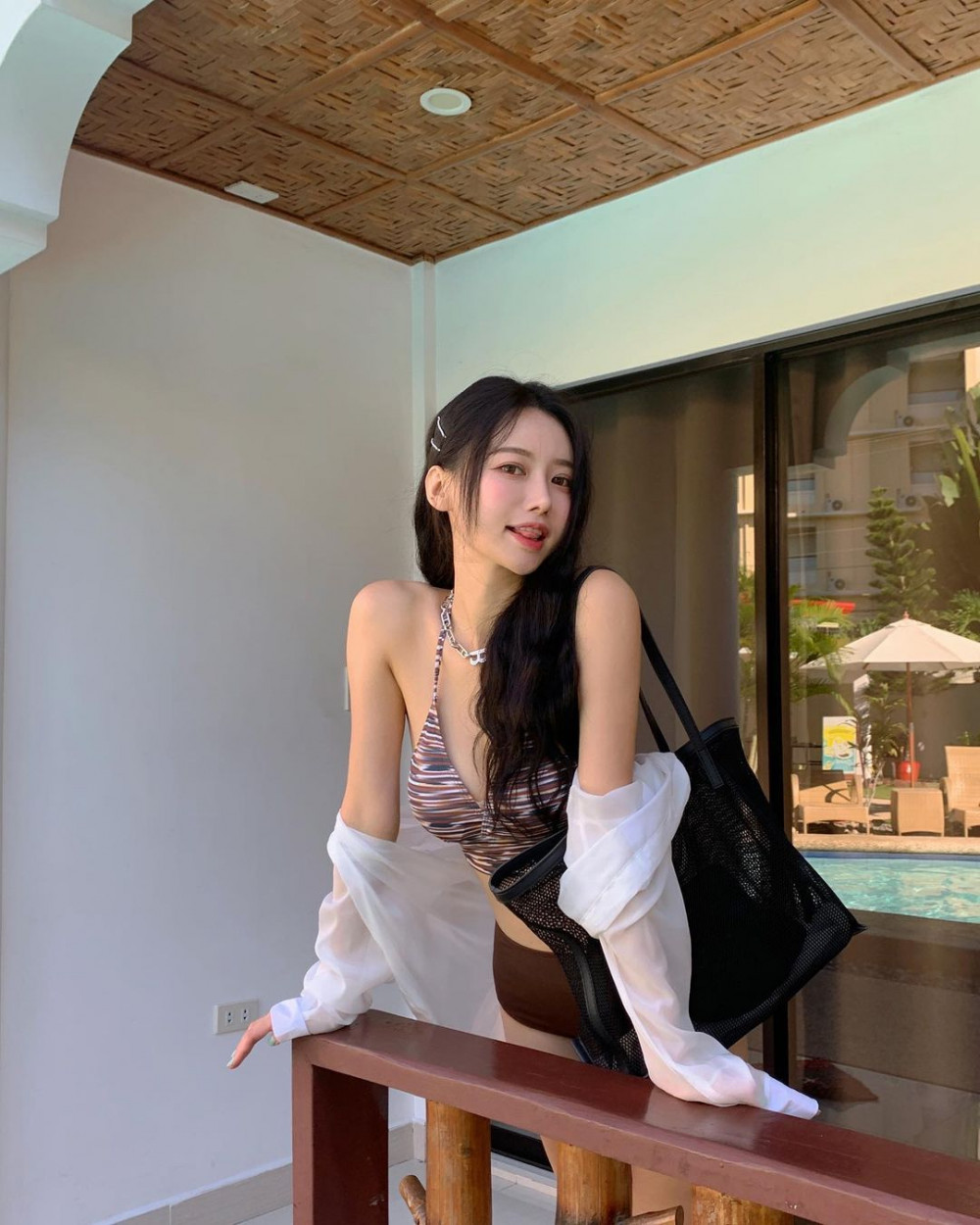 동그란 가슴 아래를 받쳐주는 와이어브라 흰 비키니