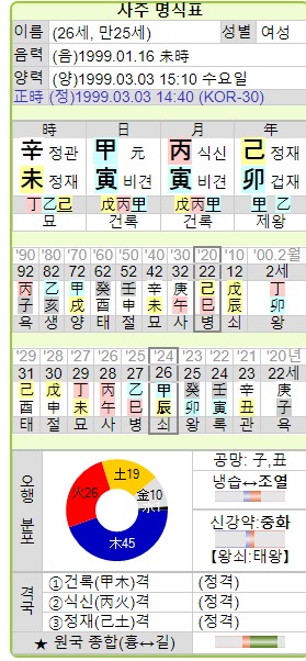 생시는 모르겠고 정기신 중 기만 오지게 센 처자다. 용신으로 설기해야....