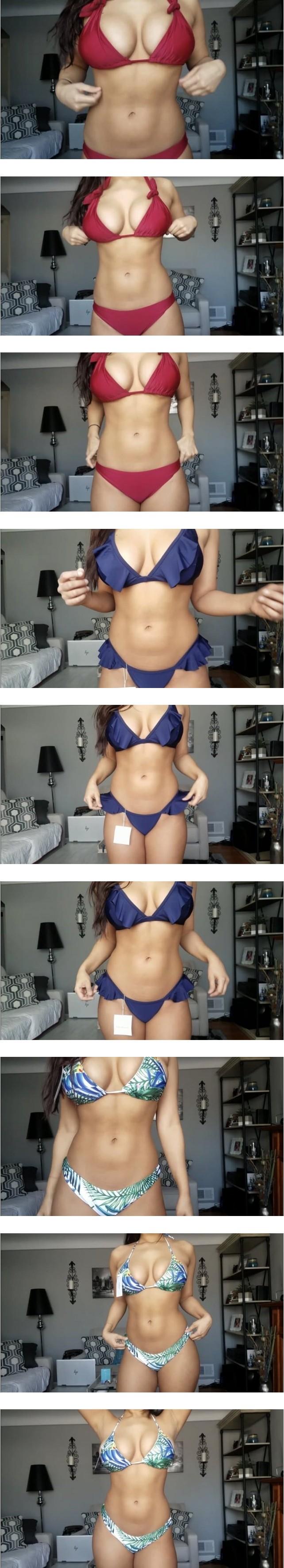 동그란 가슴 아래를 받쳐주는 와이어브라 흰 비키니