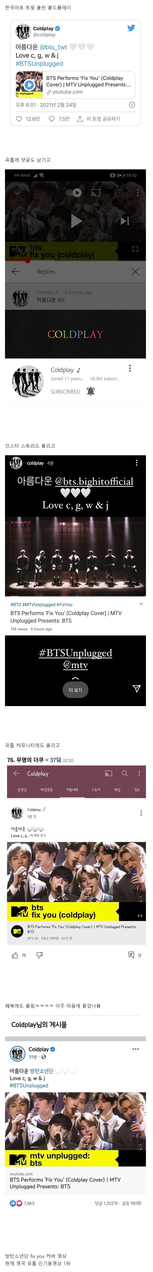 방탄소년단 fix you 커버 칭찬한 콜드플레이