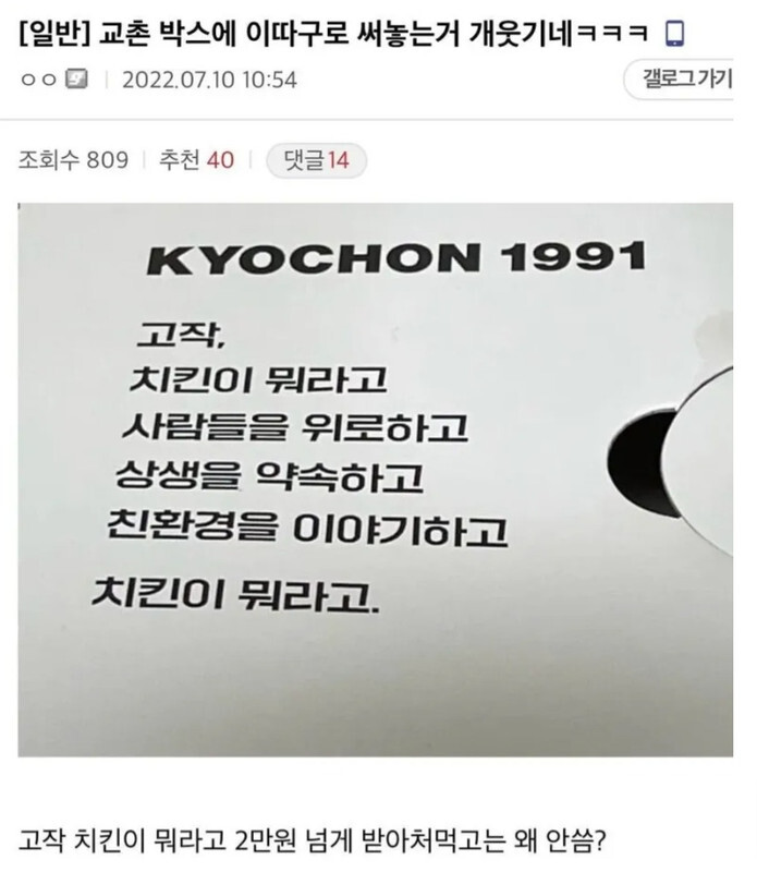 교촌 박스에 이따구로 써놓는거 개 웃기네