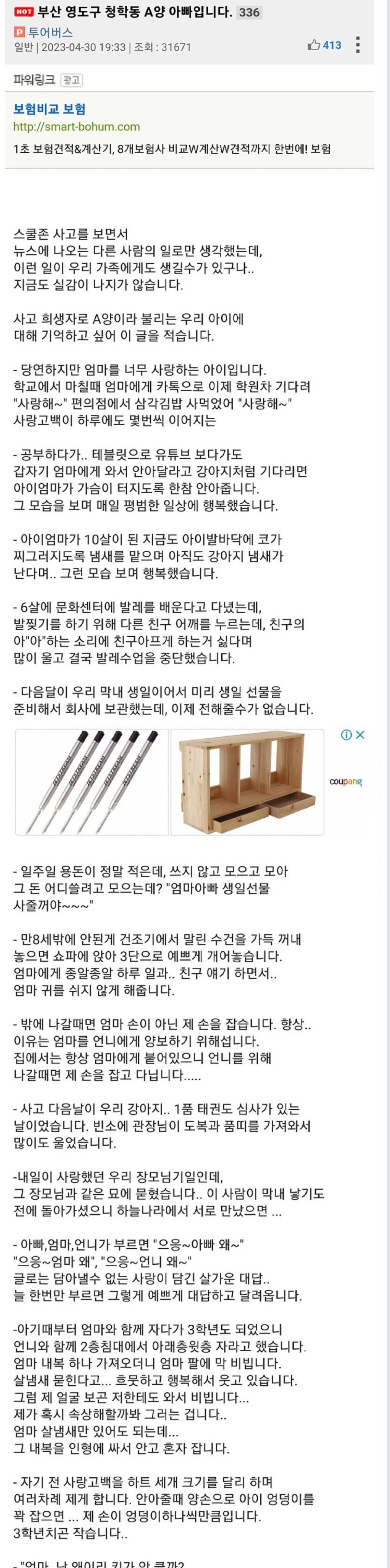 10살 딸 잃은 아빠의 글