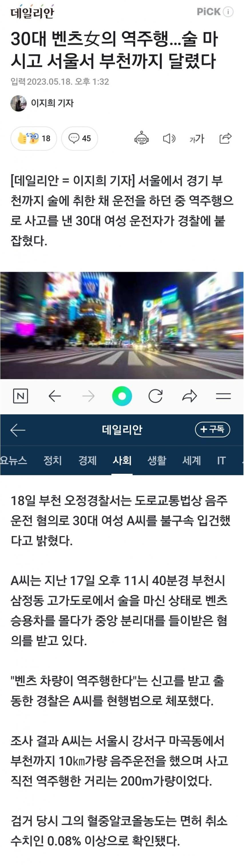 서울에서 부천까지 역주행으로 달린 30대 벤츠녀 음주운전