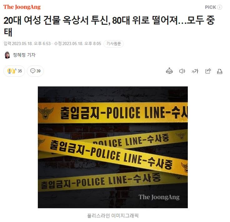 대구 한 5층 건물 옥상에서 투신한 20대 여성이 80대 행인 위로 떨어져 두 명 모두 크게 다치는 사고가 발생했다.