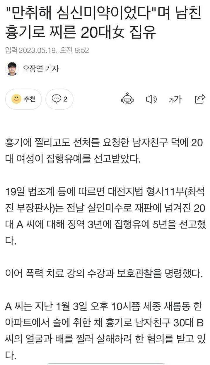 술쳐먹고 남친 흉기로 피습했는데 선처요구해서 집유받음