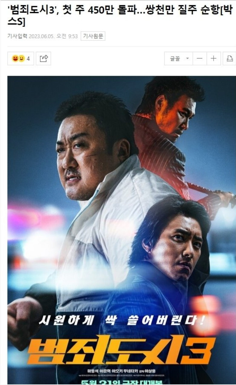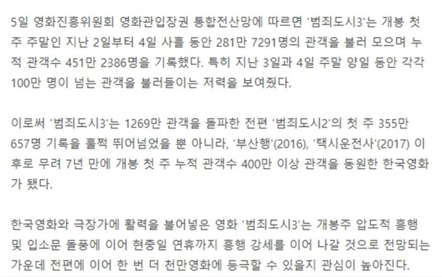 범죄도시는 3까지 대성공 벌써 450만 달성