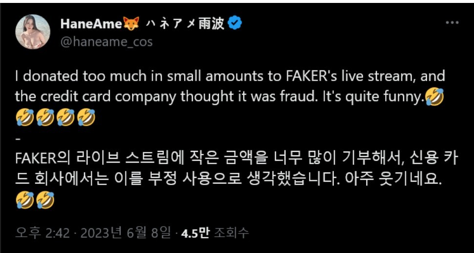 페이커에게 도네 여러번 하다 카드 정지 당한 처자
