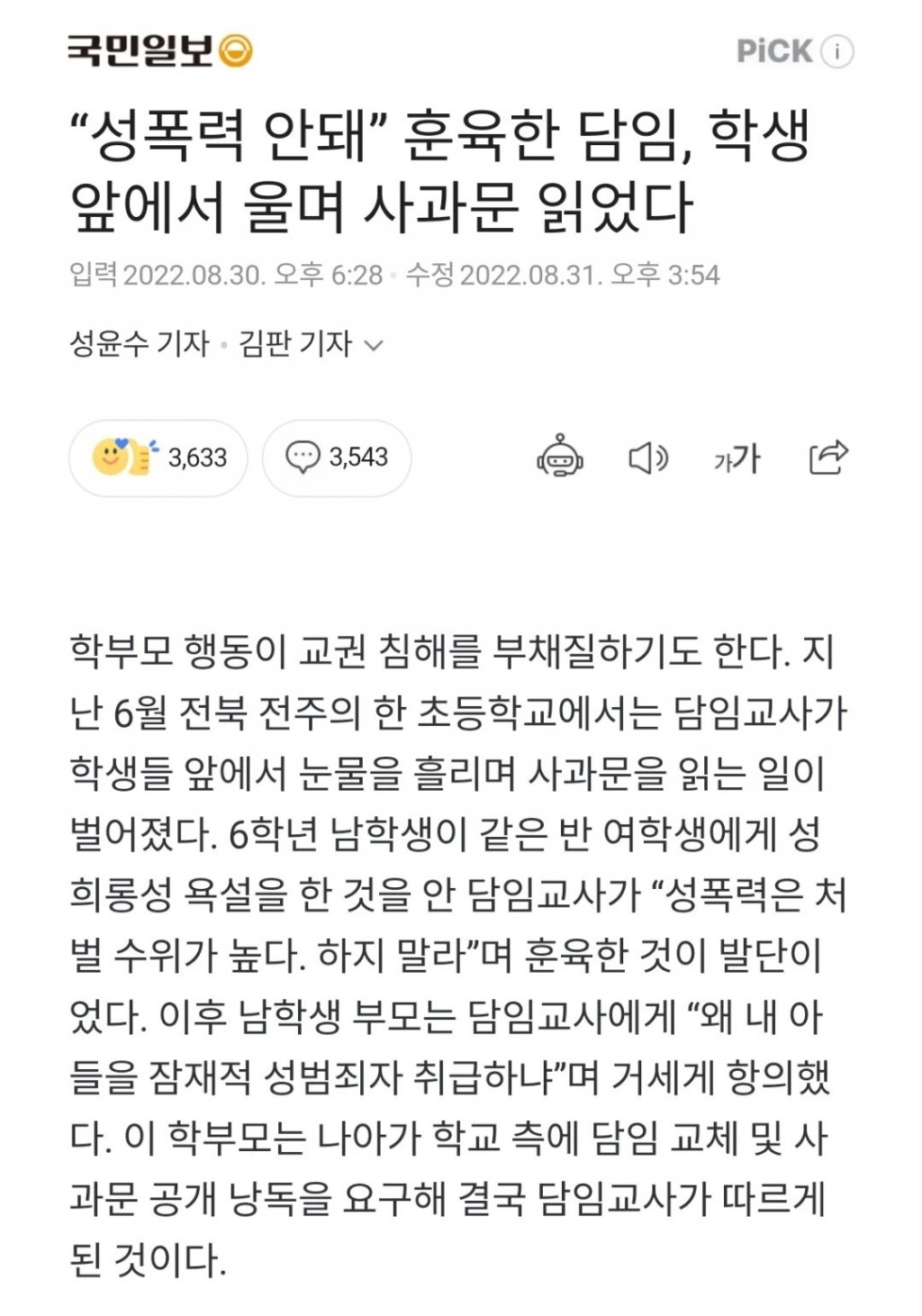 이 학부모는 나아가 학교 측에 담임 교체 및 사과문 공개 낭독을 요구해 결국 담임교사가 따르게 된 것이다.