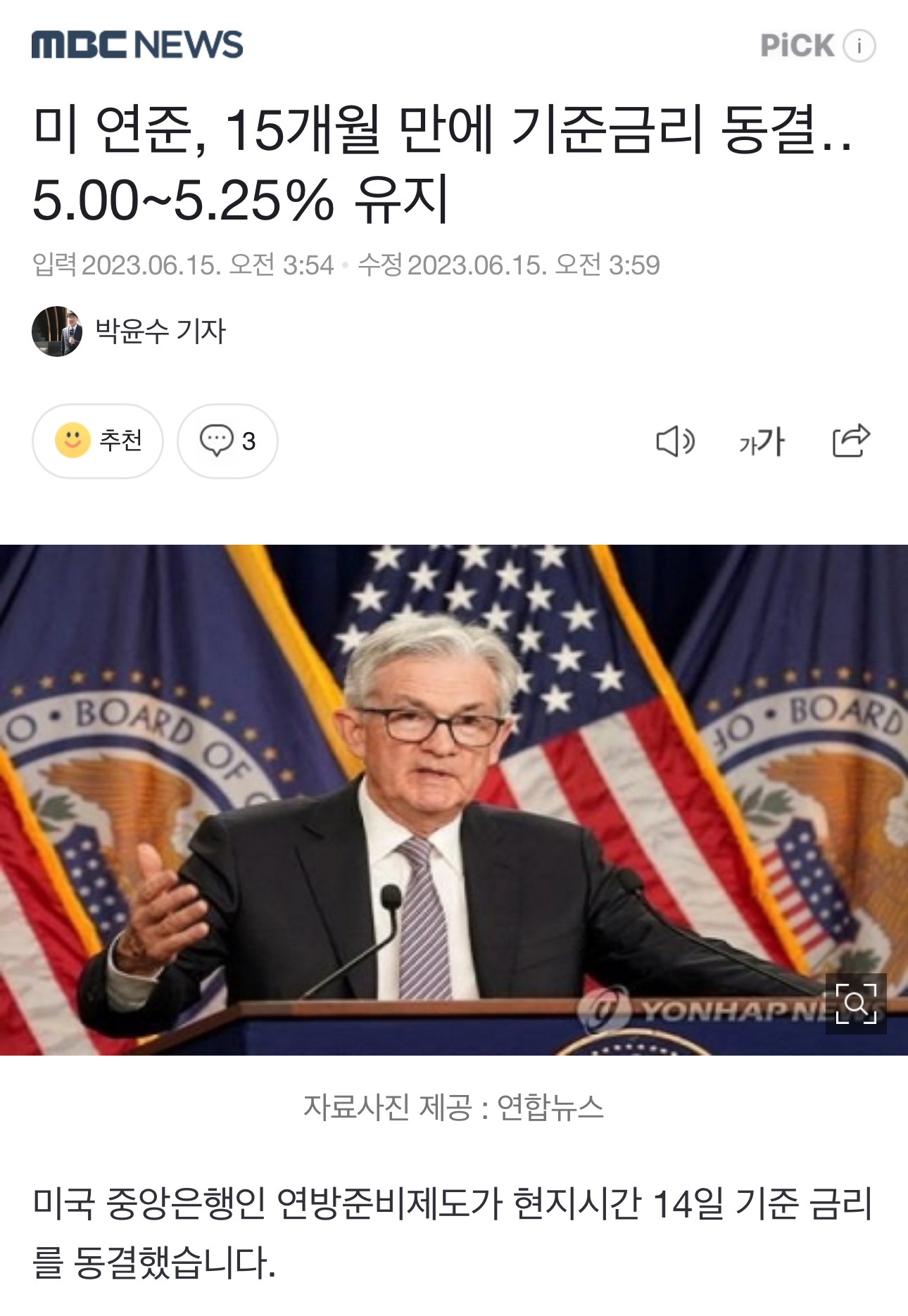 미 연준, 15개월 만에 기준금리 동결‥ 5.00~5.25% 유지