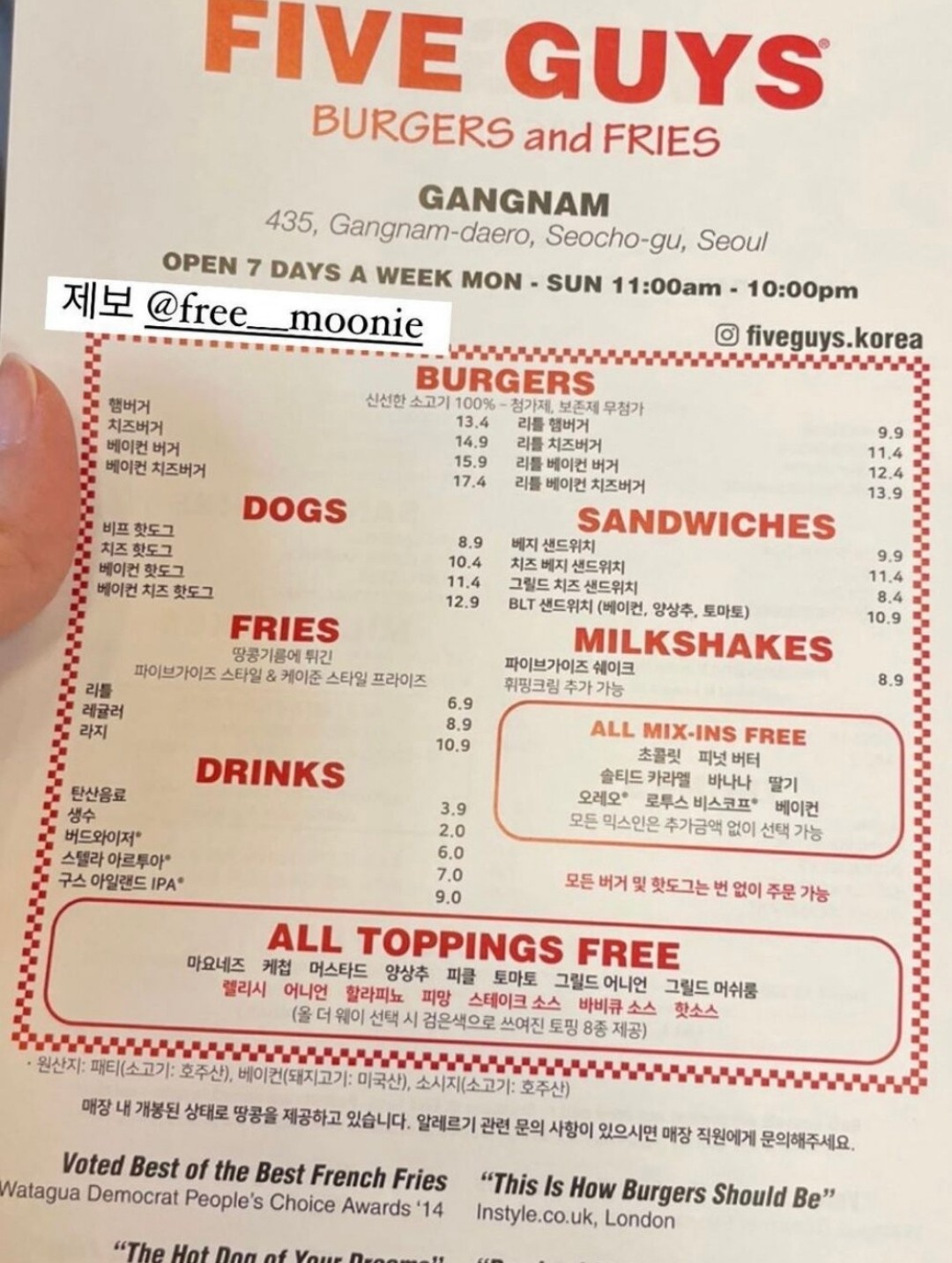 다음주에 오픈하는 파이브가이즈 국내가격