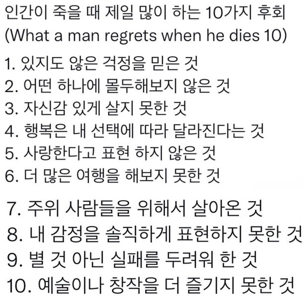 인간이 죽을 때 가장 많이 하는 후회 10가지