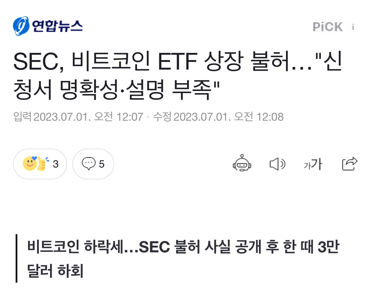 SEC, 비트코인 ETF 상장 불허…"신청서 명확성·설명 부족"