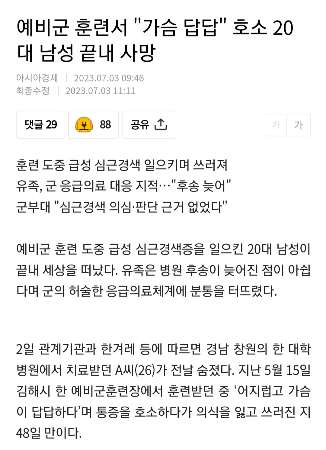 예비군 훈련서 가슴 답답하다 호소한 20대 남성 사망