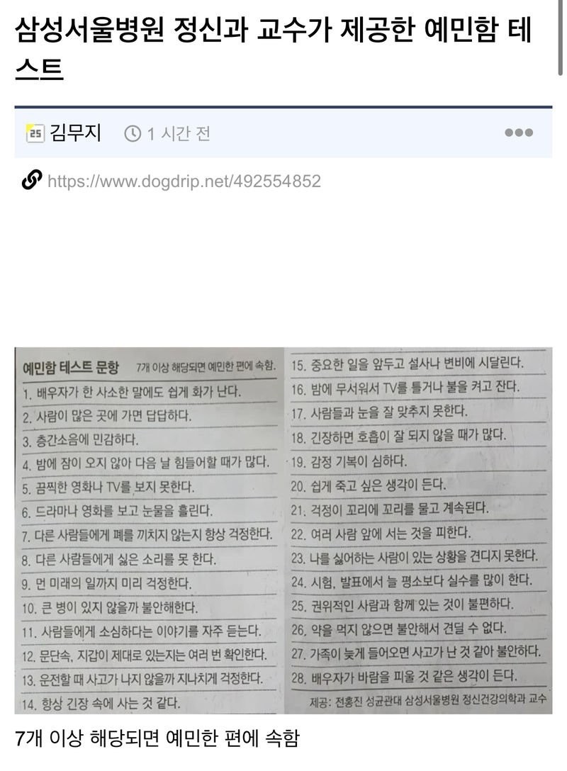 삼성서울병원 정신과 교수가 제공한 예민함 테스트