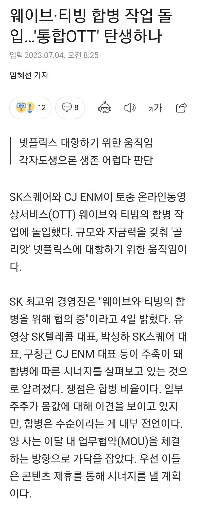 웨이브·티빙 합병 작업 돌입…'통합OTT' 탄생하나