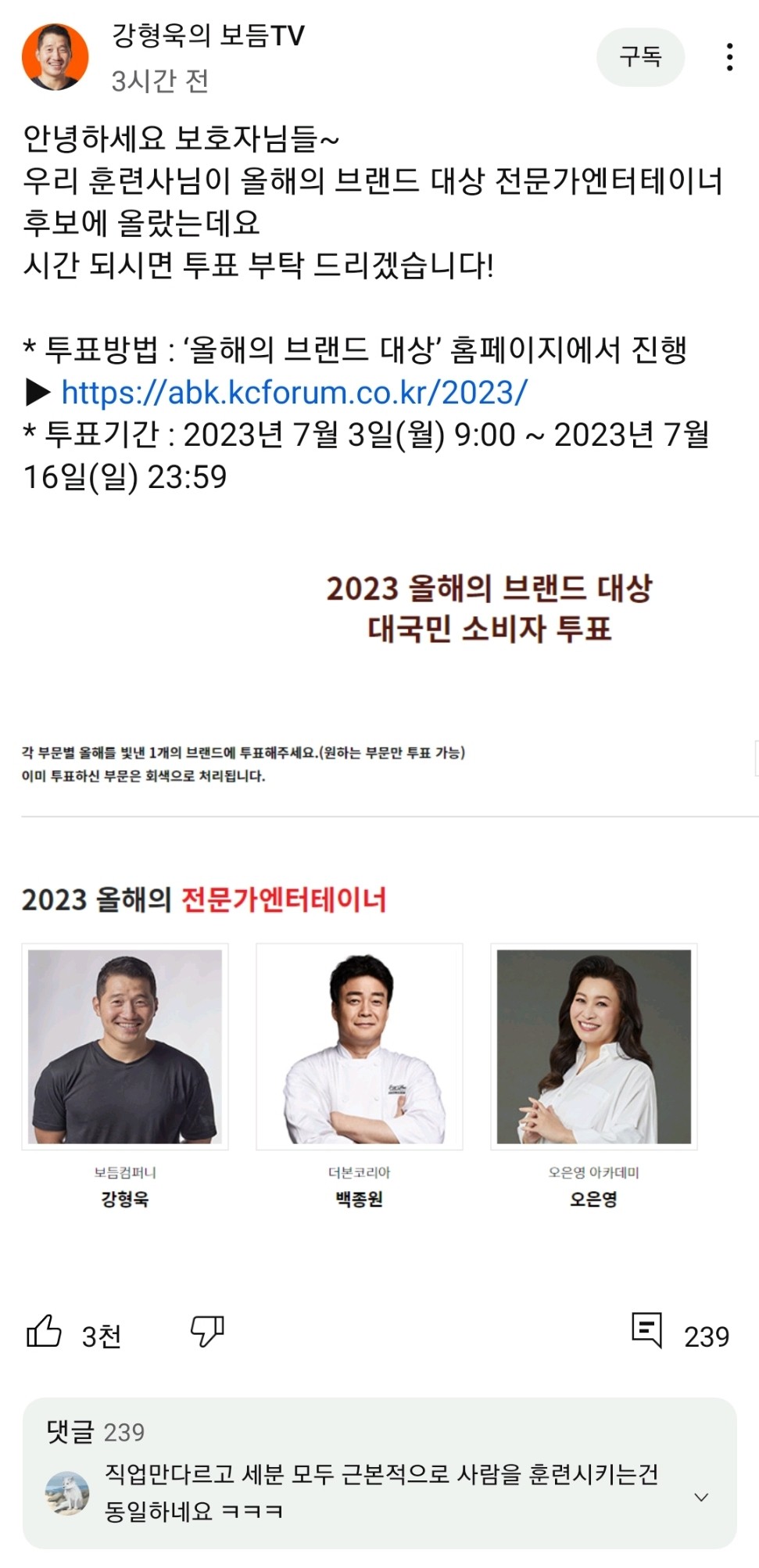 2023 올해의 브랜드 대상 전문가엔터테이너 후보 3명