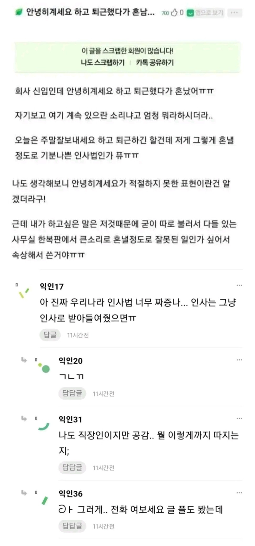 신입이 퇴근할 때마다 안녕히 계세요 하고 가버림