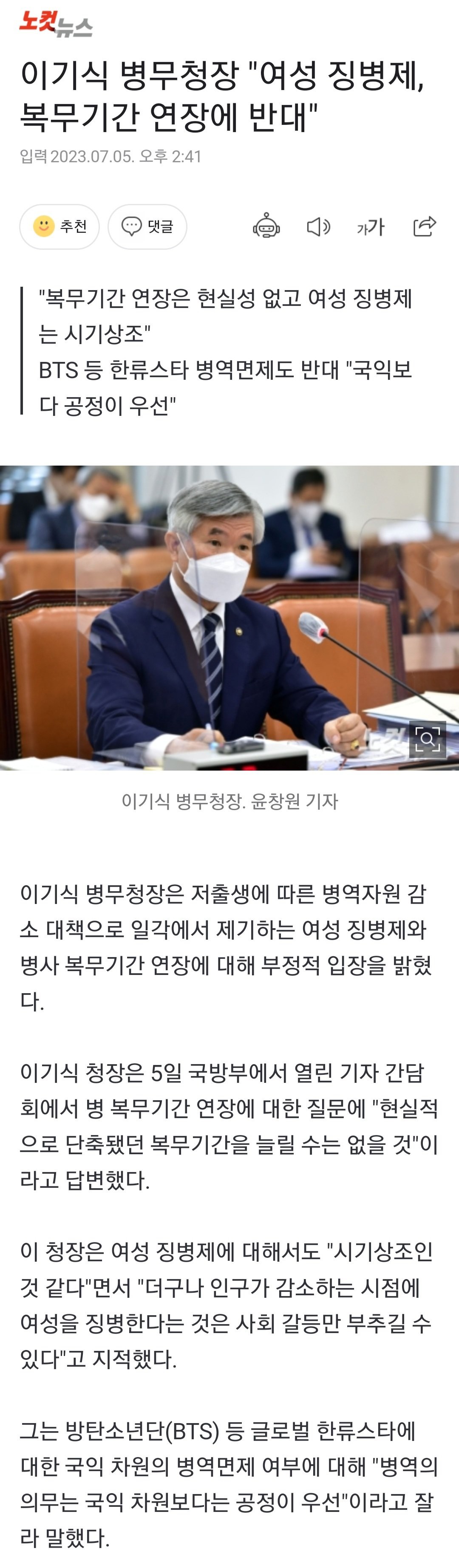 이기식 병무청장 "여성 징병제, 복무기간 연장에 반대"