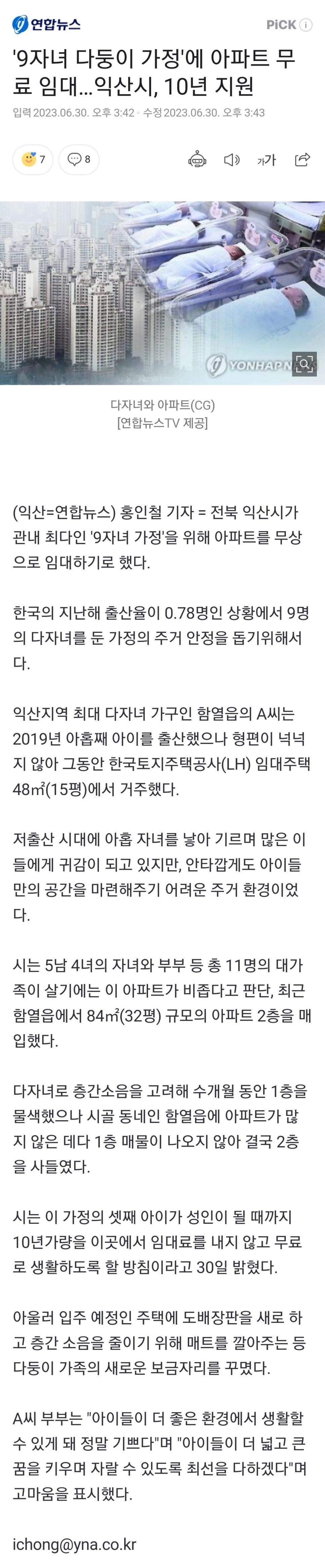 9자녀 다둥이 가정에 아파트 무료 임대