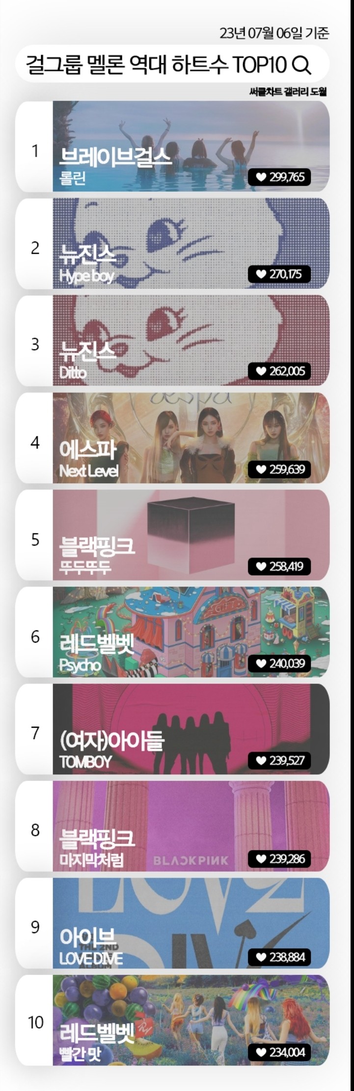역대 걸그룹 노래 멜론 하트수 TOP 10