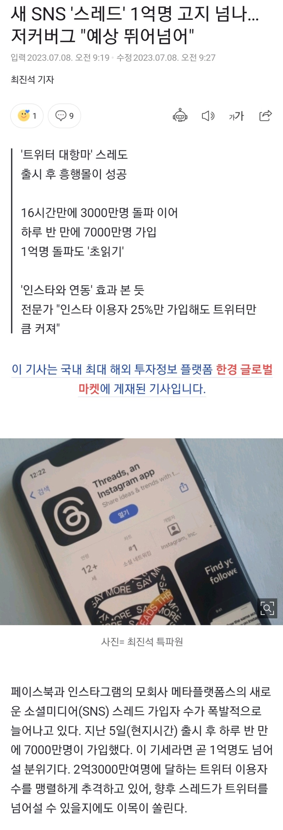 트위터 대항마 새 SNS '스레드' 하루만에 7천만명 가입