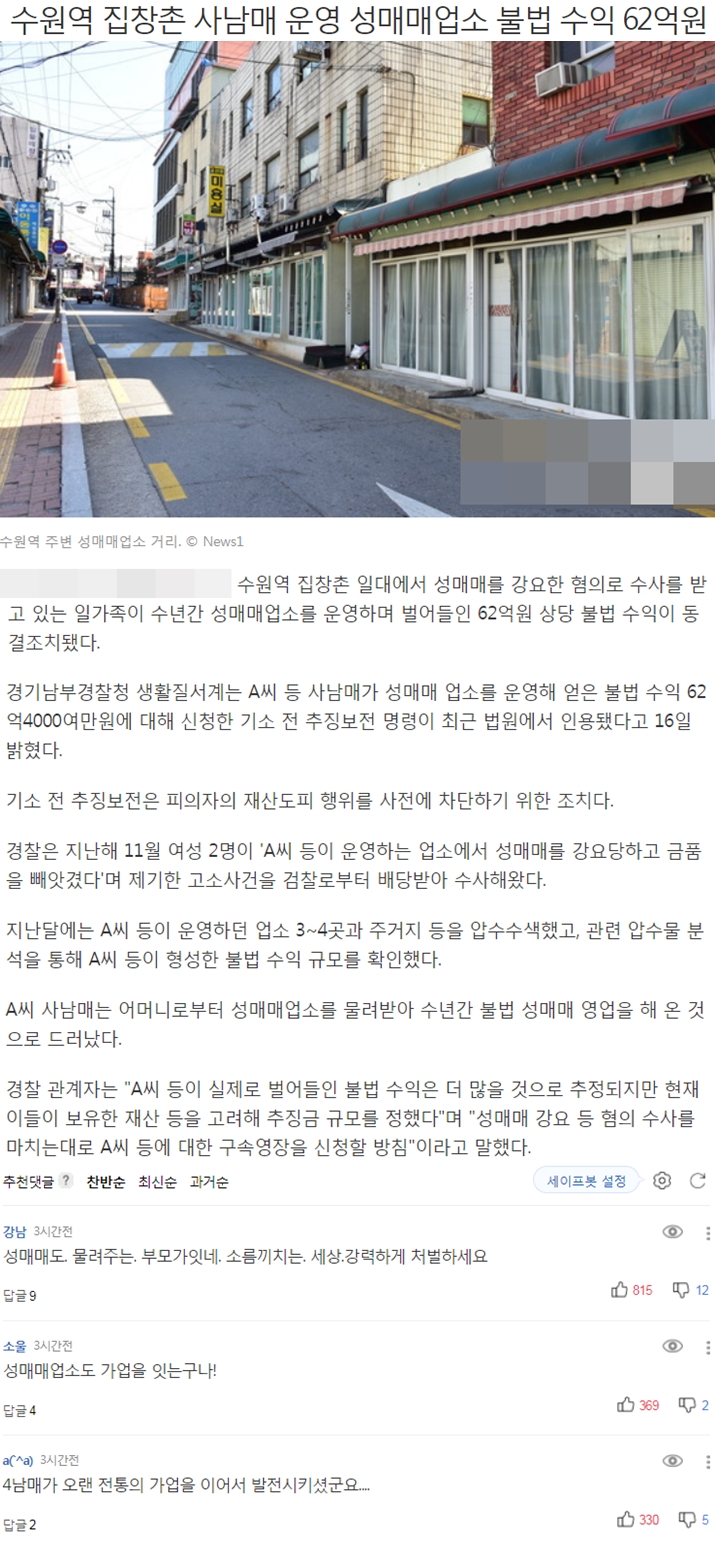 수원역 집창촌 사남매 운영 성매매업소 불법 수익 62억원 추징보전