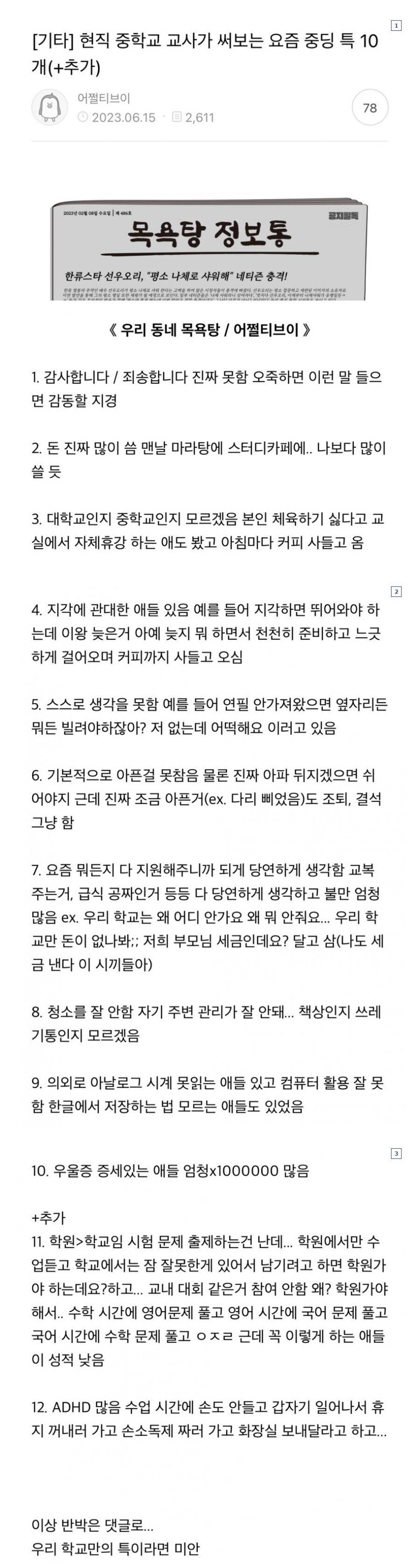 현역 중학교 교사가 쓴 요즘 중학생 특징