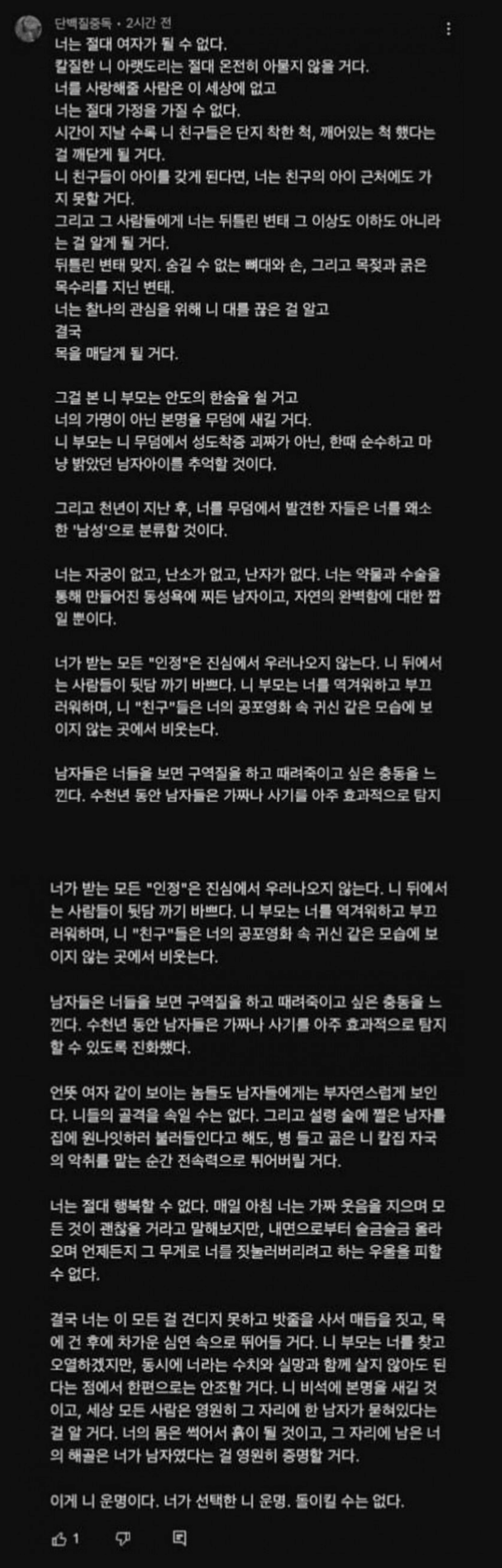트랜스젠더 유튜브에 달린 악플 ㄷㄷ