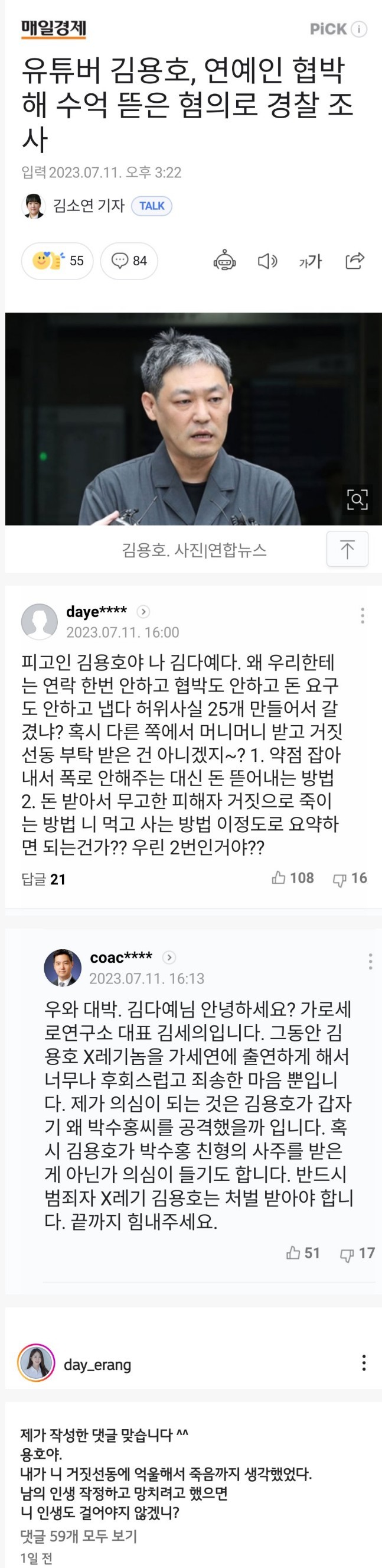 김용호 경찰조사 기사에 댓글 단 박수홍 와이프