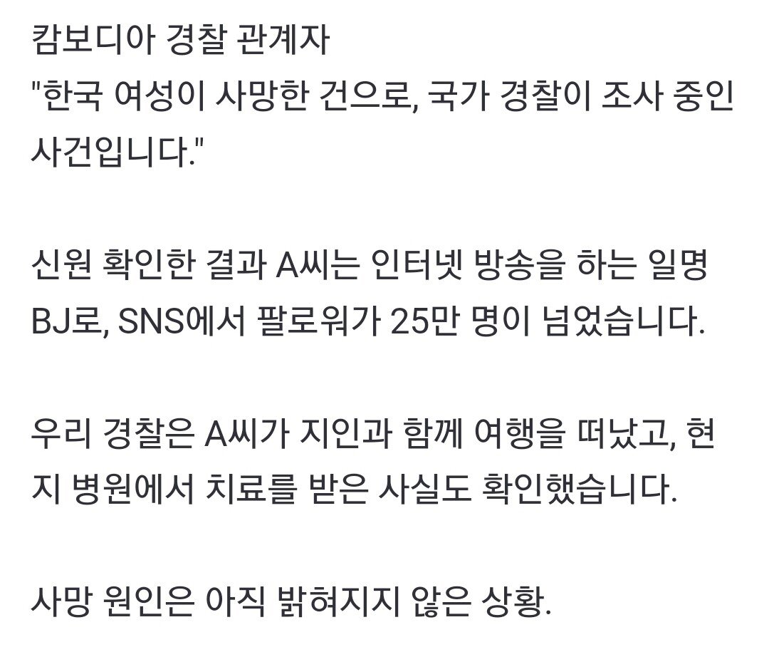 韓 여성 BJ, 캄보디아서 이불에 싸여 숨진채 발견