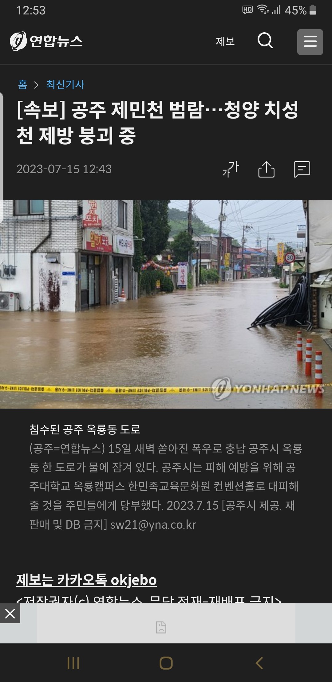 [속보] 공주 제민천 범람…청양 치성천 제방 붕괴