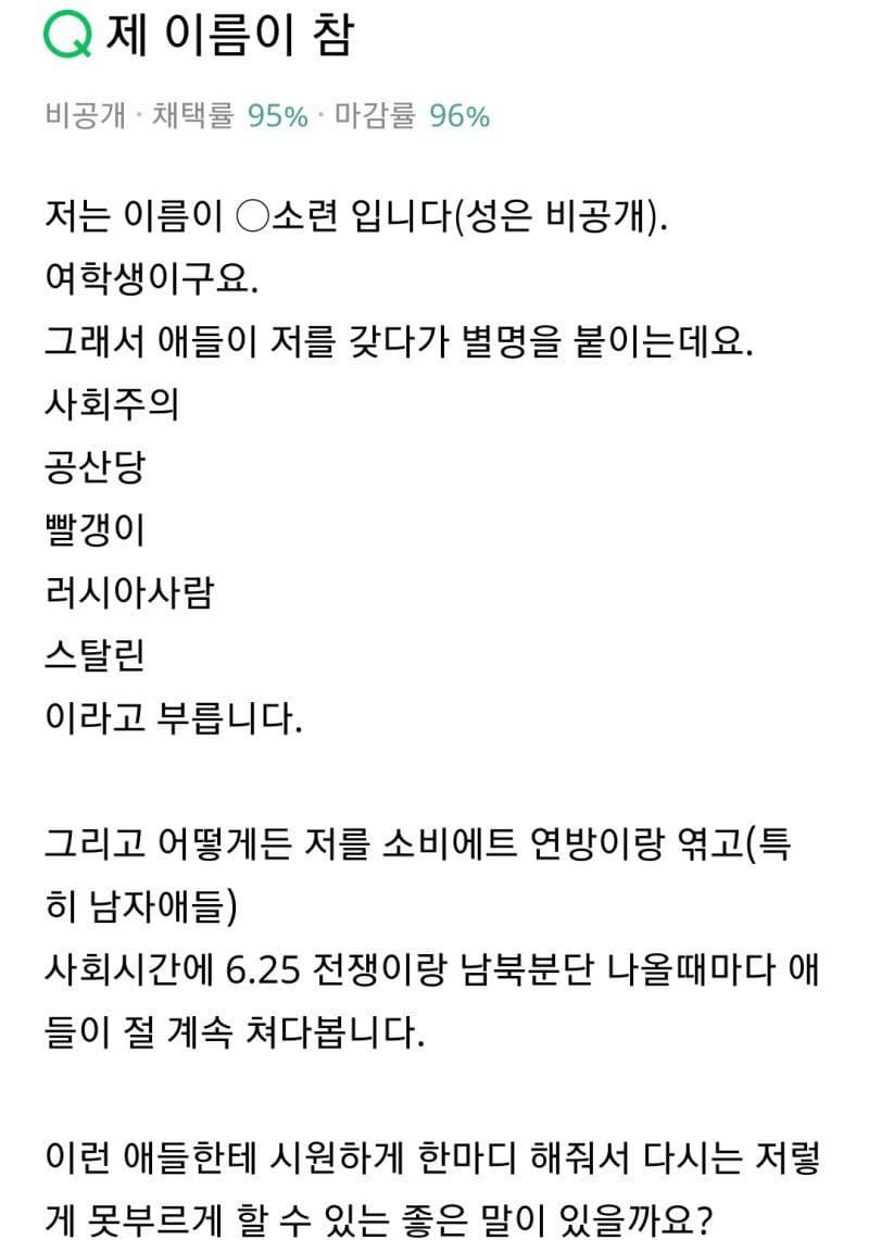 이름 때문에 친구들이 빨갱이라고 놀려요