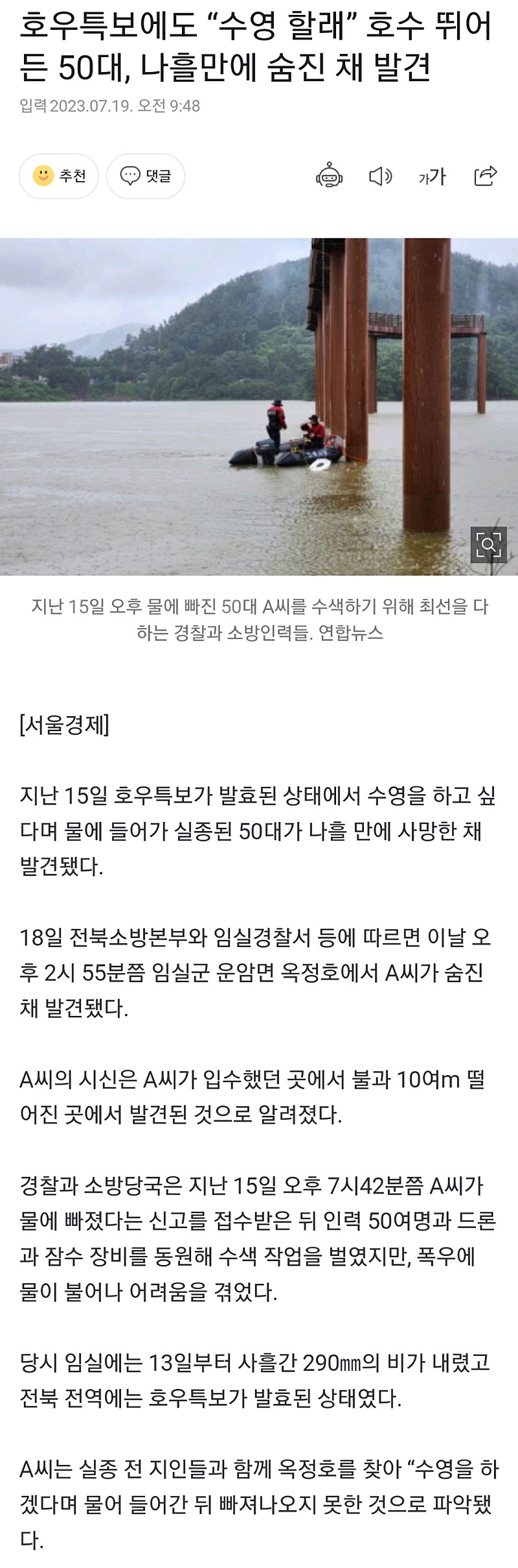 호우특보에도 “수영 할래” 호수 뛰어든 50대, 나흘만에 숨진 채 발견
