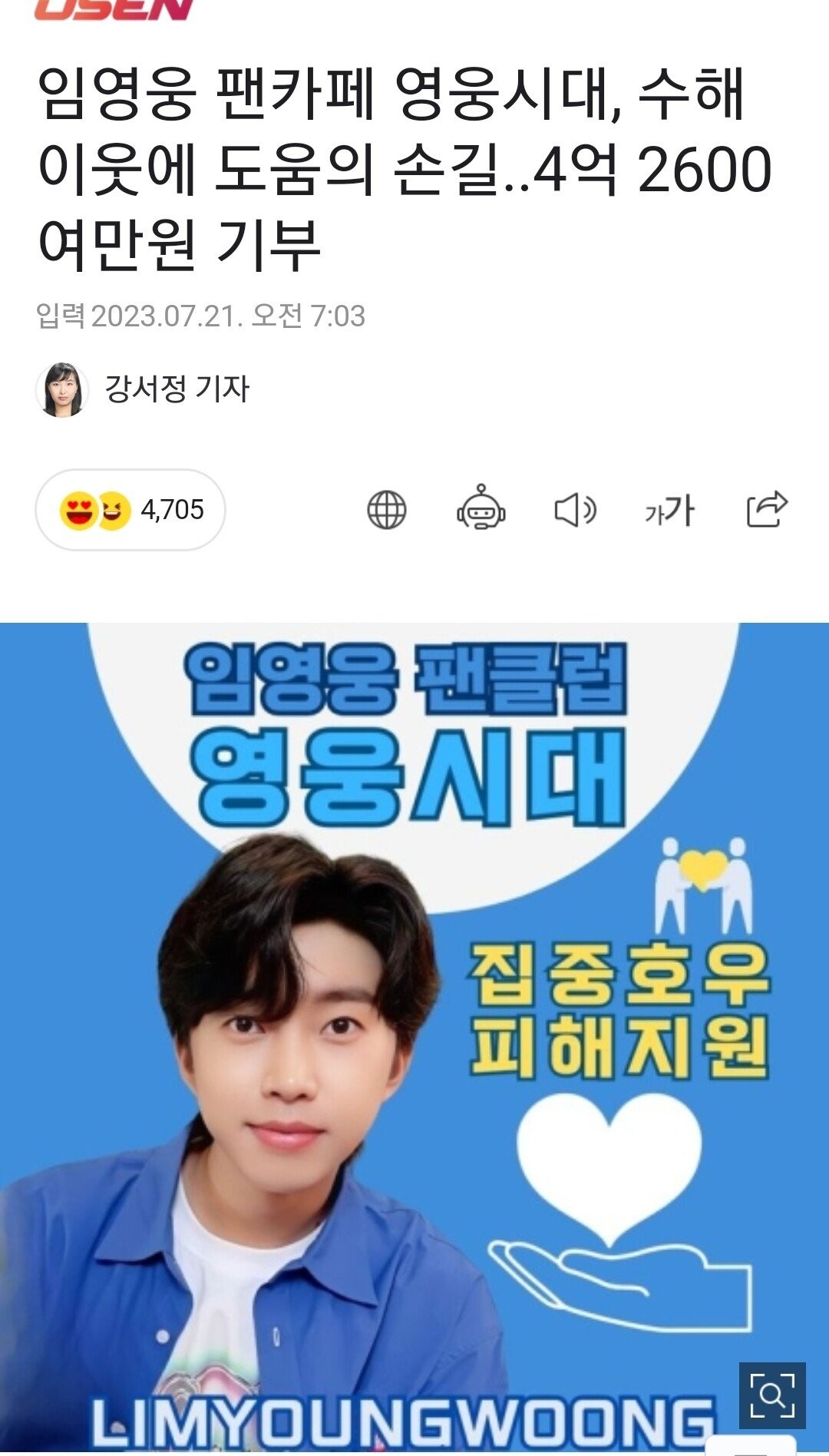 임영웅 팬카페 영웅시대, 수해 이웃에 4억 2600여만원 기부