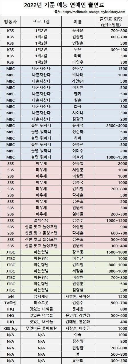 작년기준 공중파 예능 주요 연예인 출연료