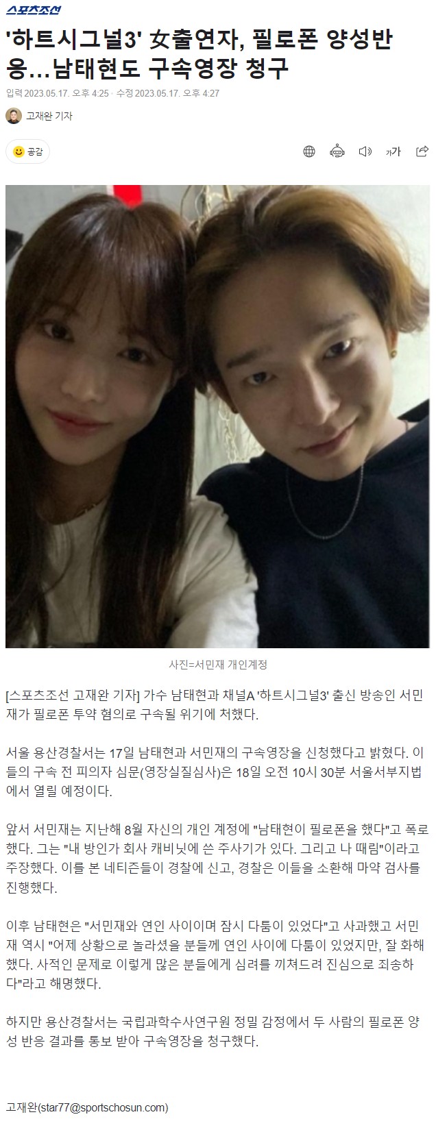'하트시그널3' 女출연자, 필로폰 양성반응…남태현도 구속영장 청구