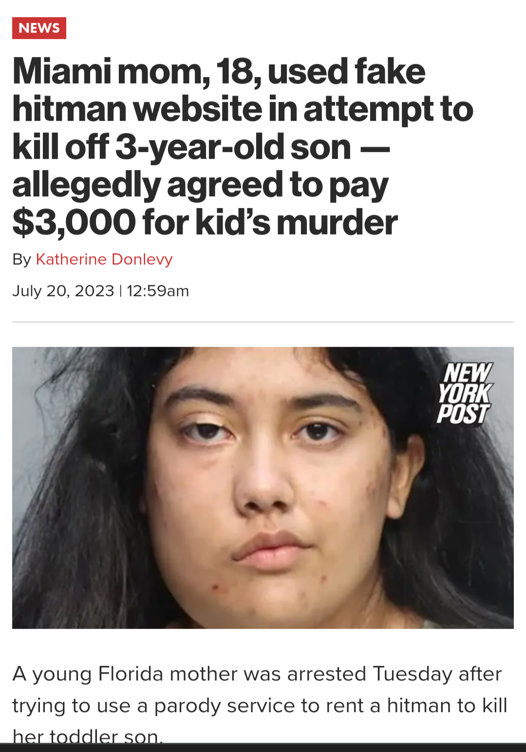 마이애미 경찰에 따르면 자스민 파에즈라는 18세 여성이 https://rentahitman.com/ 이라는 패러디 사이트에서 자신의 아들을 죽여달라고 살인 청부 의뢰를 넣었다가 체포되었다고 함.