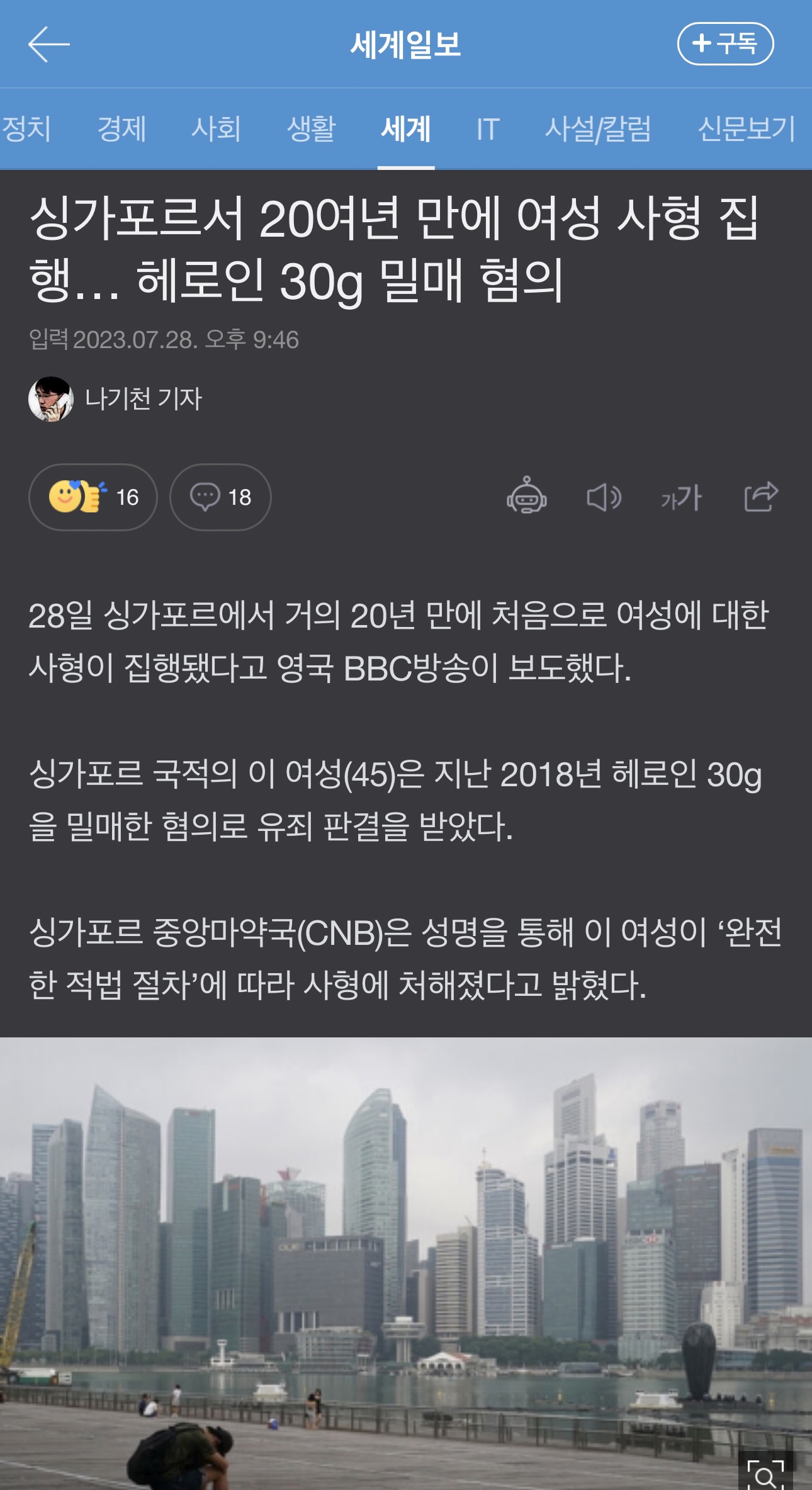 싱가포르에서는 20여년만에 이루어지는 여성 대상 사형집행. 죄목은 마약 밀수고 어제 새벽에 집행됨