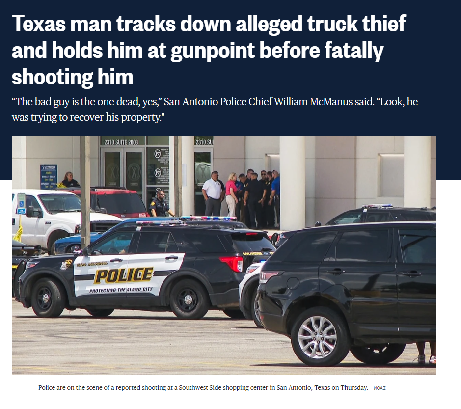 텍사스에서 트럭을 훔쳐 도망가던 범인이 소유주의 추격끝에 사살당했습니다
