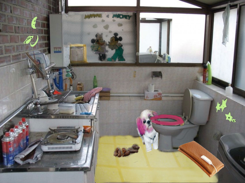 형광, 미키마우스 스티커, 싸구려 분홍색 변기 받침, 누런 장판, 염색 시츄