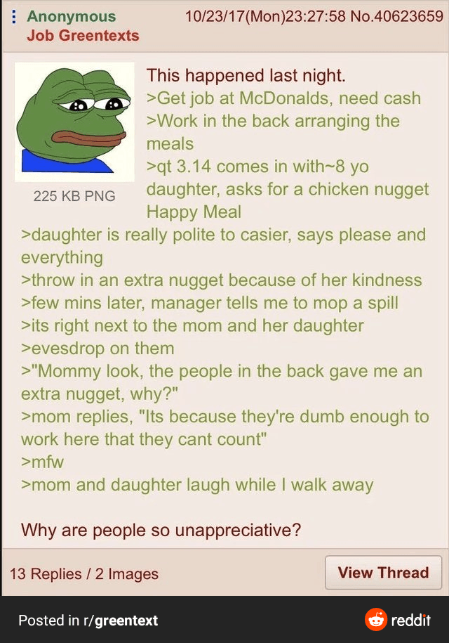 -여자애가 "엄마 저기서 일하는 사람들이 너겟 더 줬어"라고 함