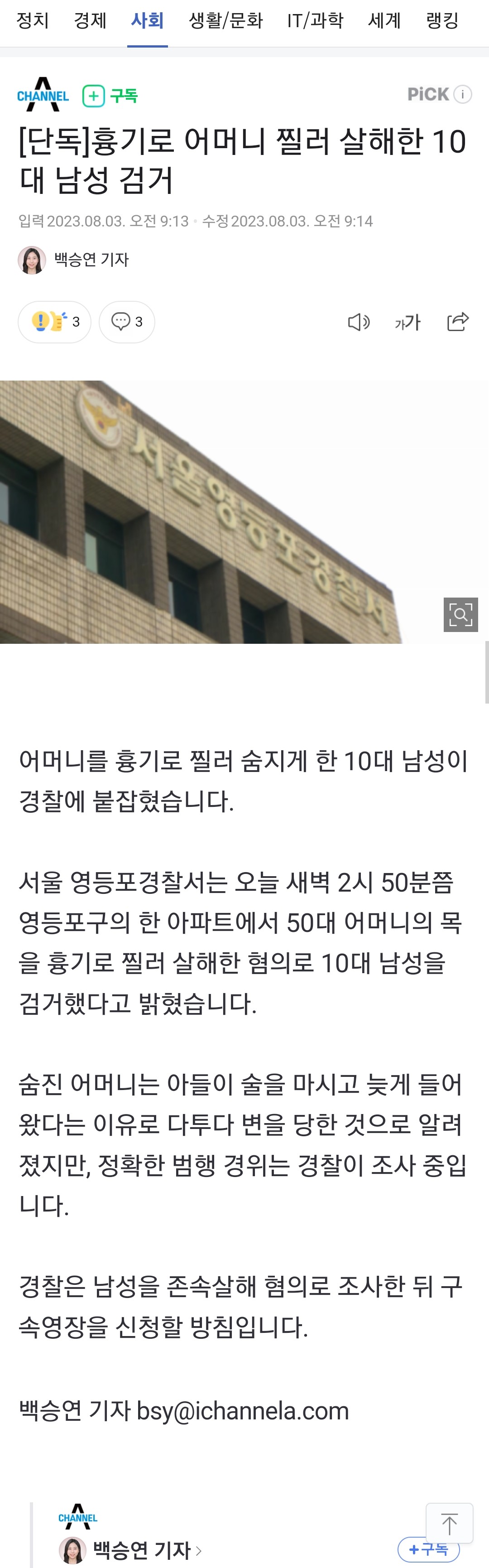 흉기로 어머니 찔러 살해한 10대 남성 검거