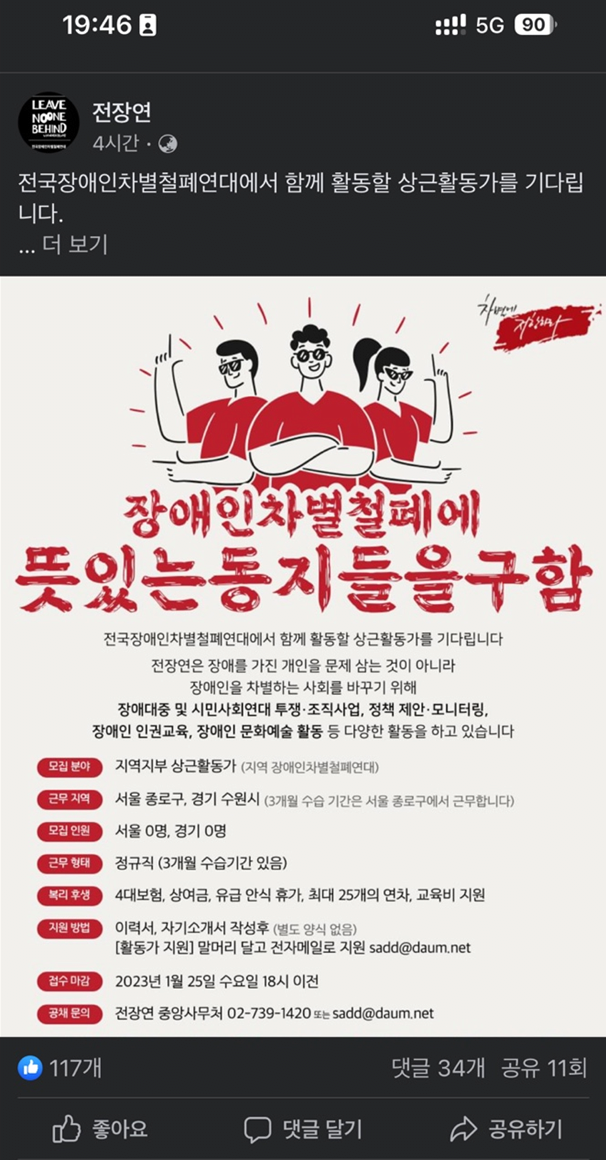 전장연 페북의 채용 공고와 댓글 일침 ㅋㅋ