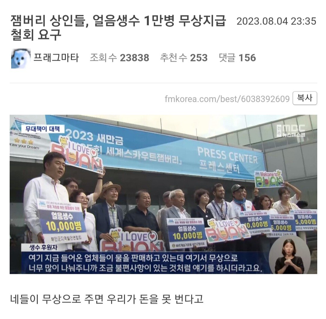 잼버리 상인들, 얼음생수 1만병 무상지급 철회요구