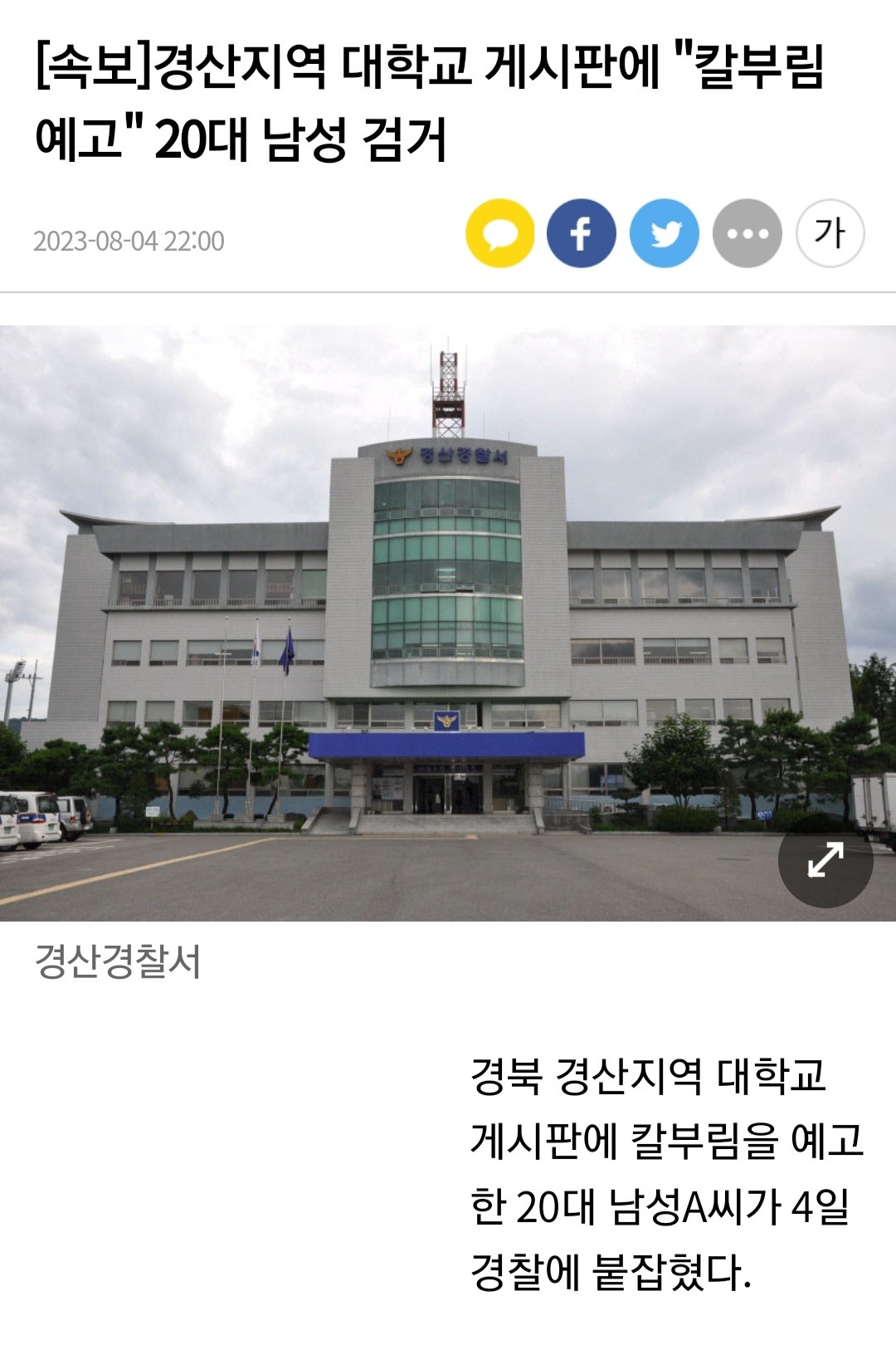 경산지역 대학교 게시판에 "칼부림 예고" 20대 남성 검거
