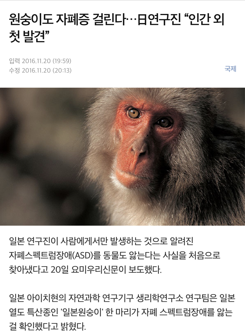 원숭이도 자폐증 걸린다. 인간 외 첫 발견