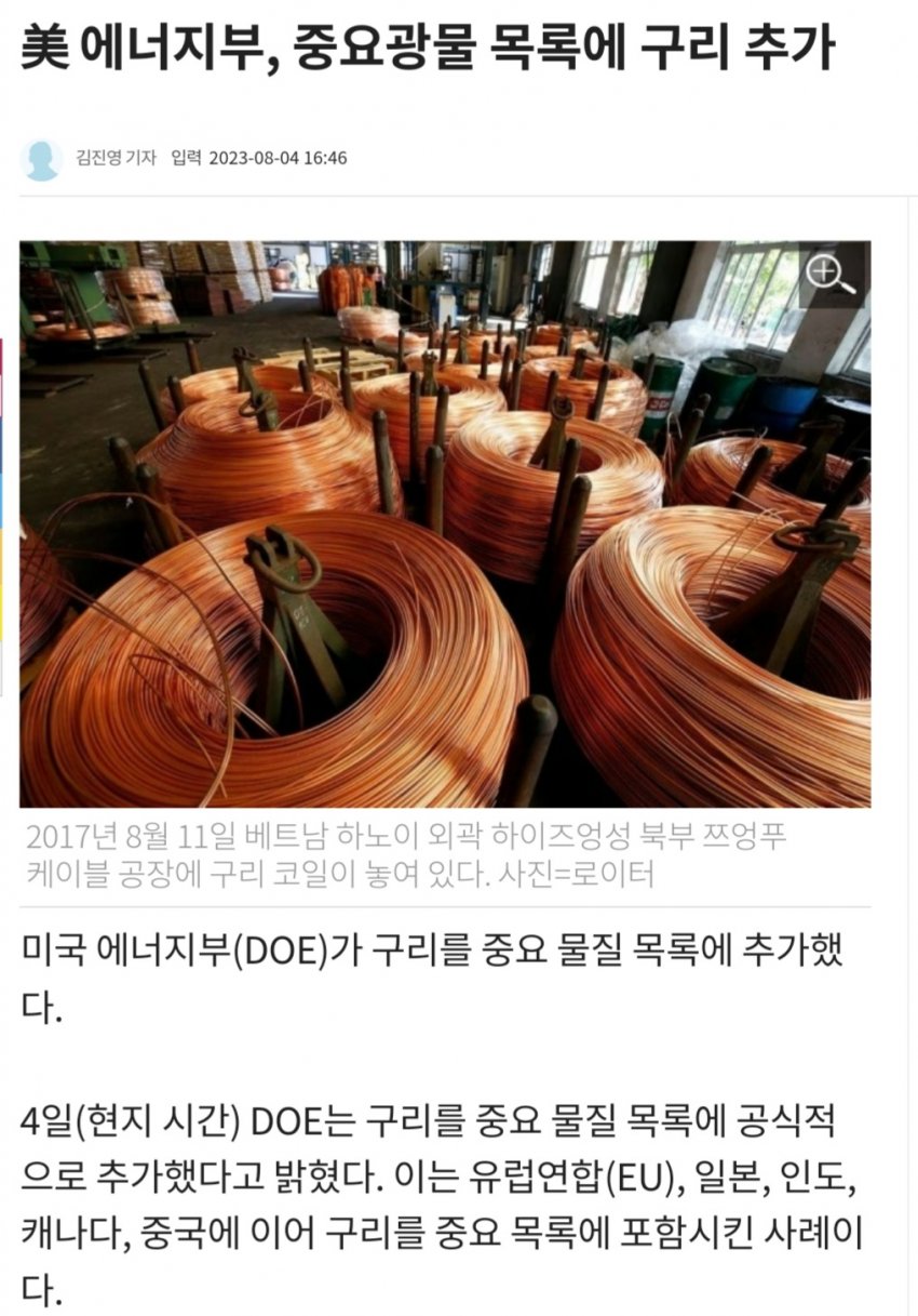 미국 중요광물 목록에 구리 추가
