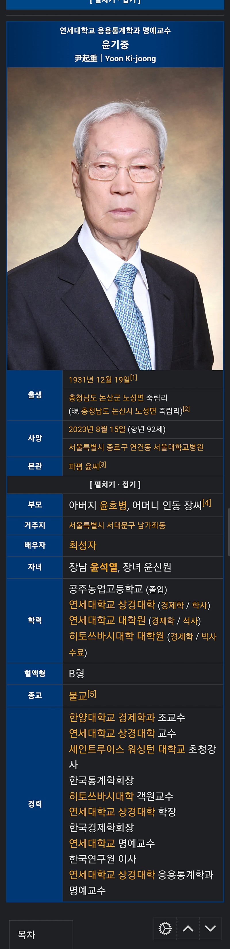 尹대통령 부친 윤기중 연세대 명예교수 별세