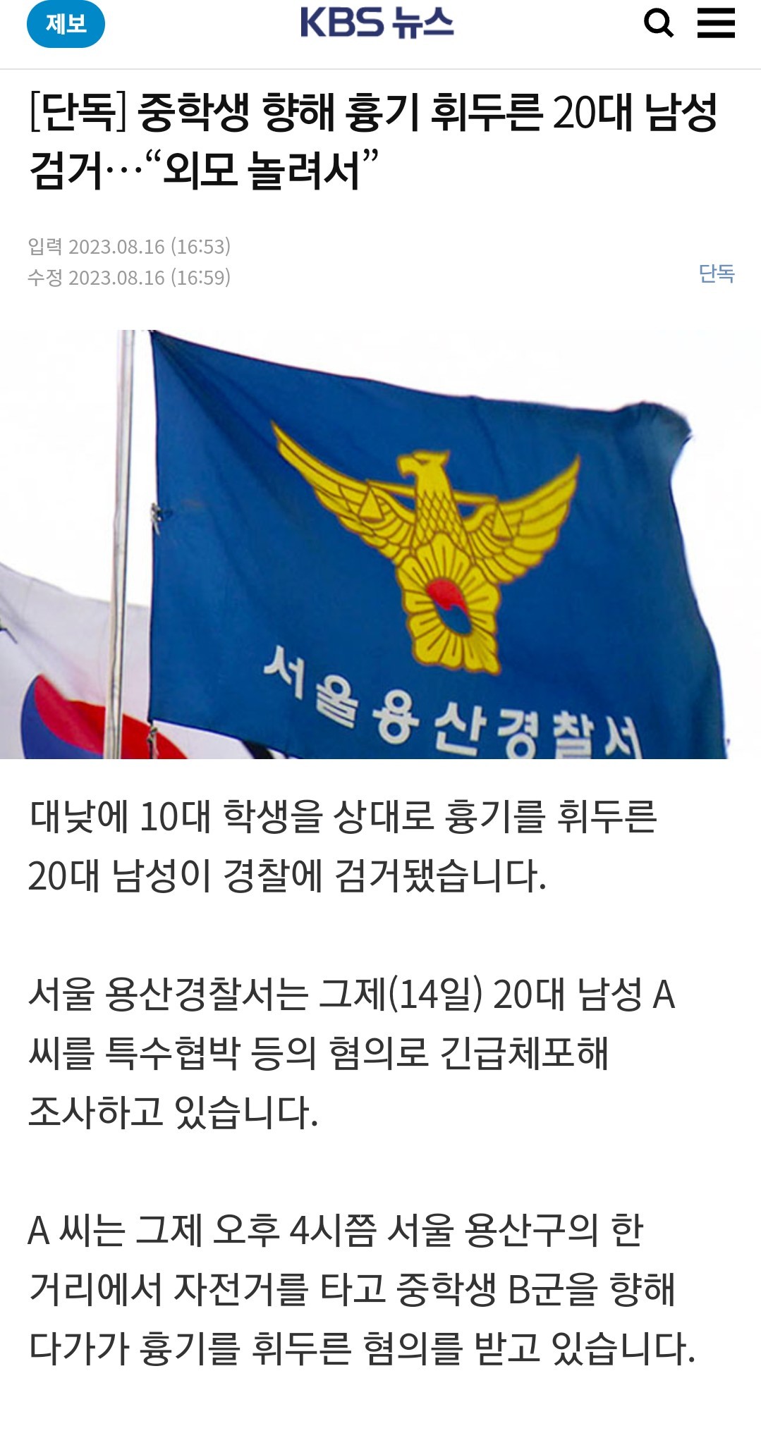 중학생 향해 흉기 휘두른 20대 남성 검거…“외모 놀려서”