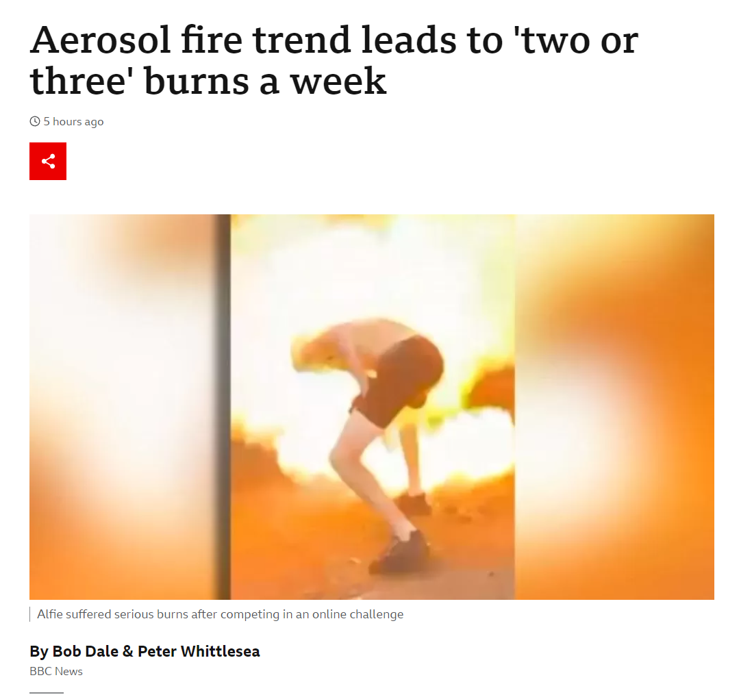 영국에서 에어로졸에 불을붙이는 놀이가 SNS에 퍼지면서 화상치료환자가 급증합니다.